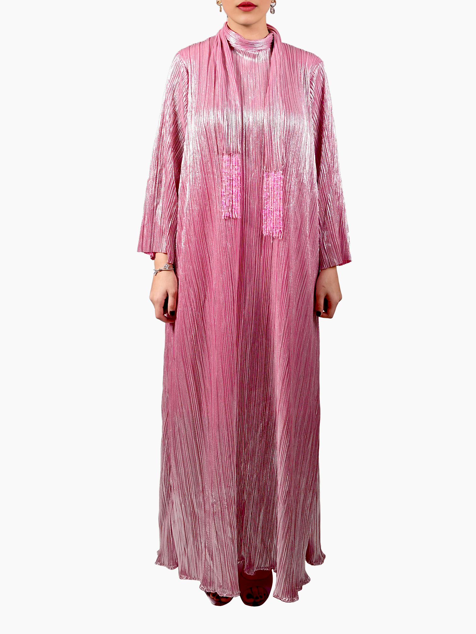 Embrace sophistication with this 140 cm high-neck kaftan, crafted from shimmering metallic plissé fabric that catches the light with every movement. The structured neckline flows seamlessly into a coordinating scarf, exquisitely adorned with hand-beaded embellishments. Each bead is meticulously placed, adding artisanal sparkle and elevating the kaftan’s refined silhouette.